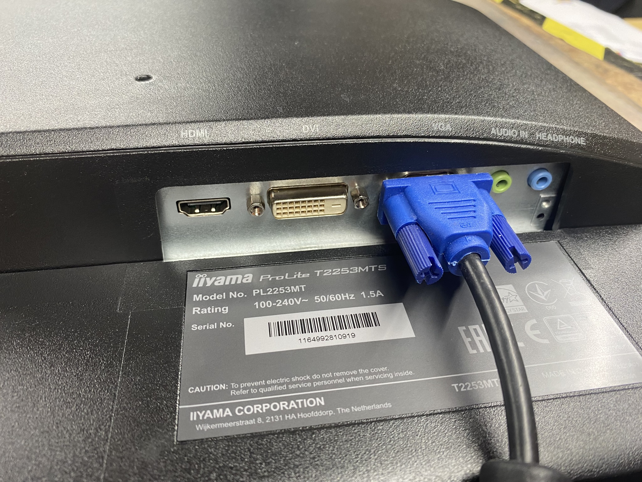 Model ProLite T2253MTS jde tedy o širokoúhlý model, dotyková vrstva je na dotyk tvrdá patrně skleněná. Připojení VGA DVI HDMI a pro dotyk USB