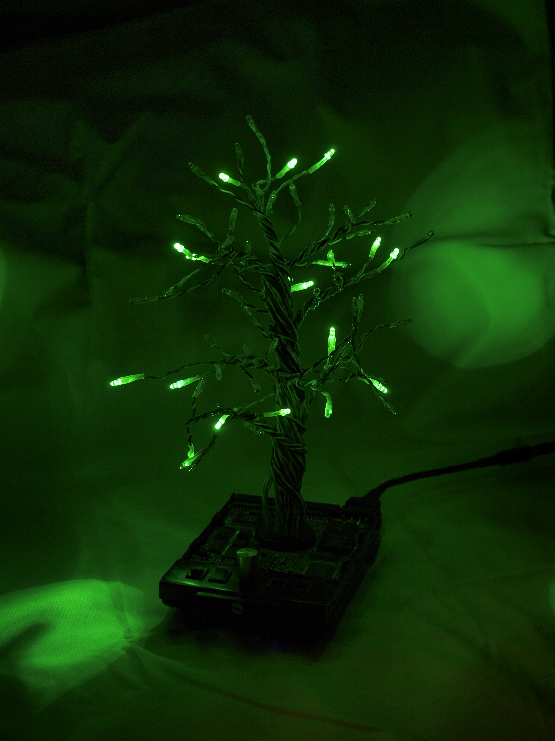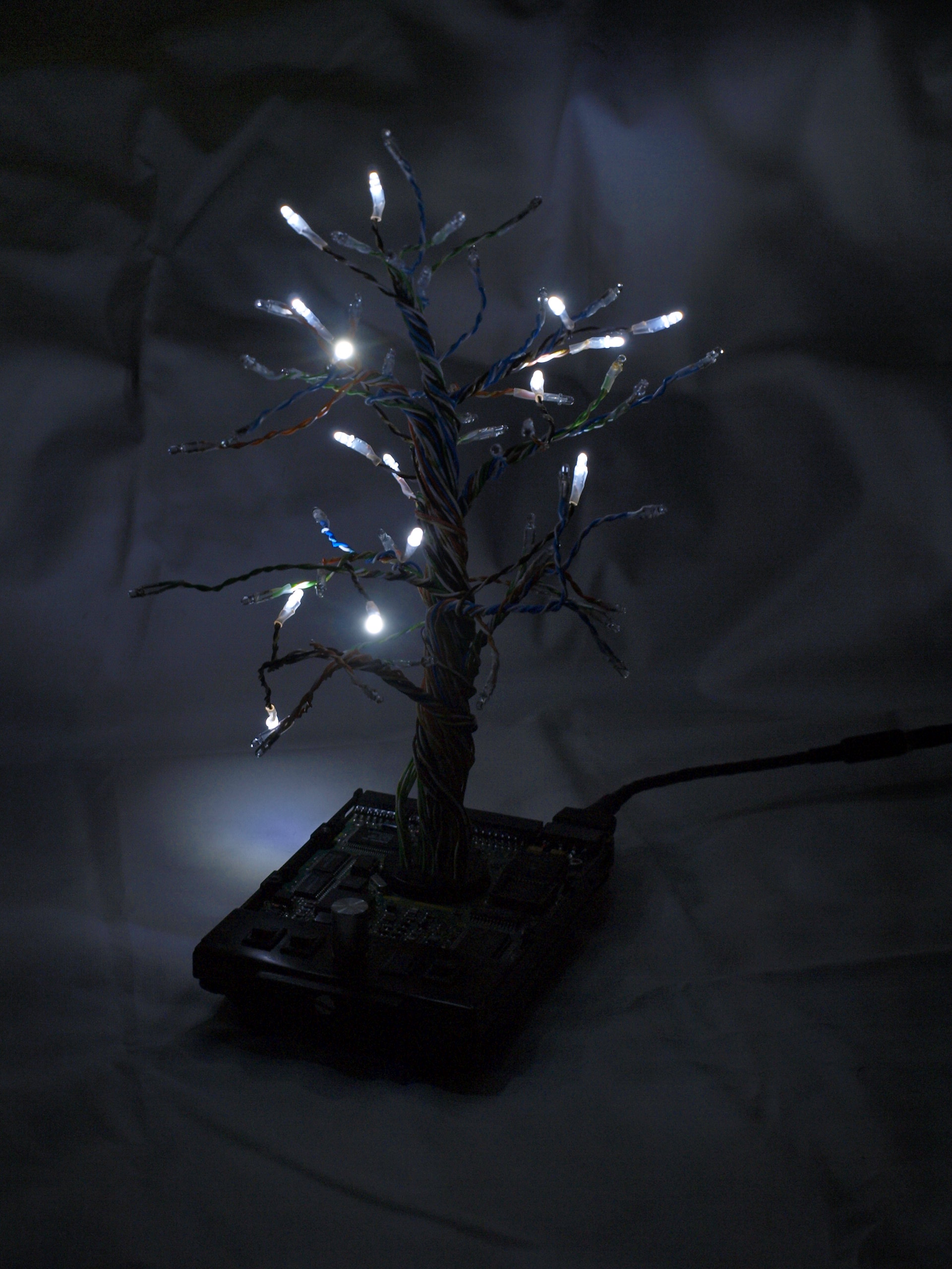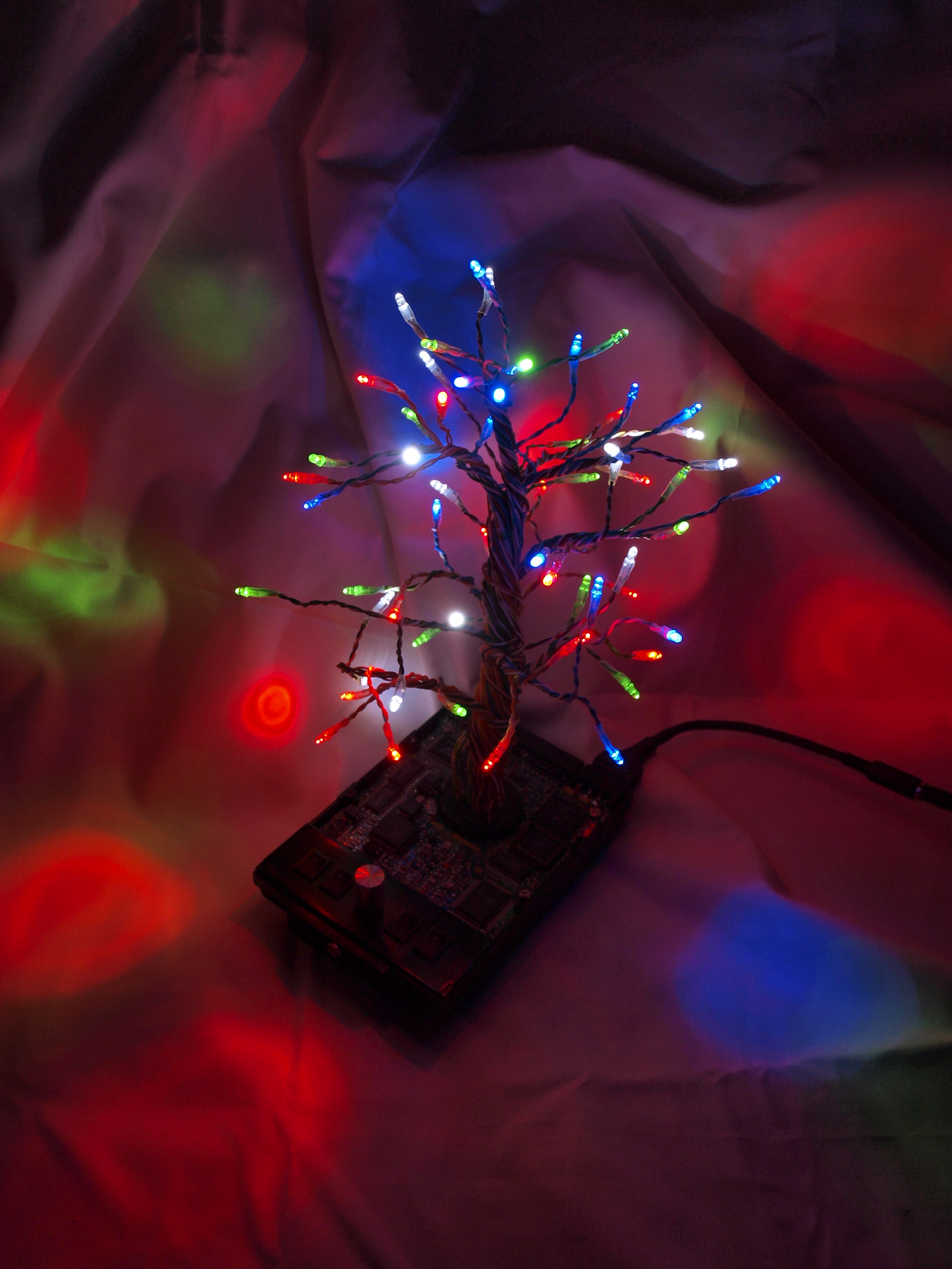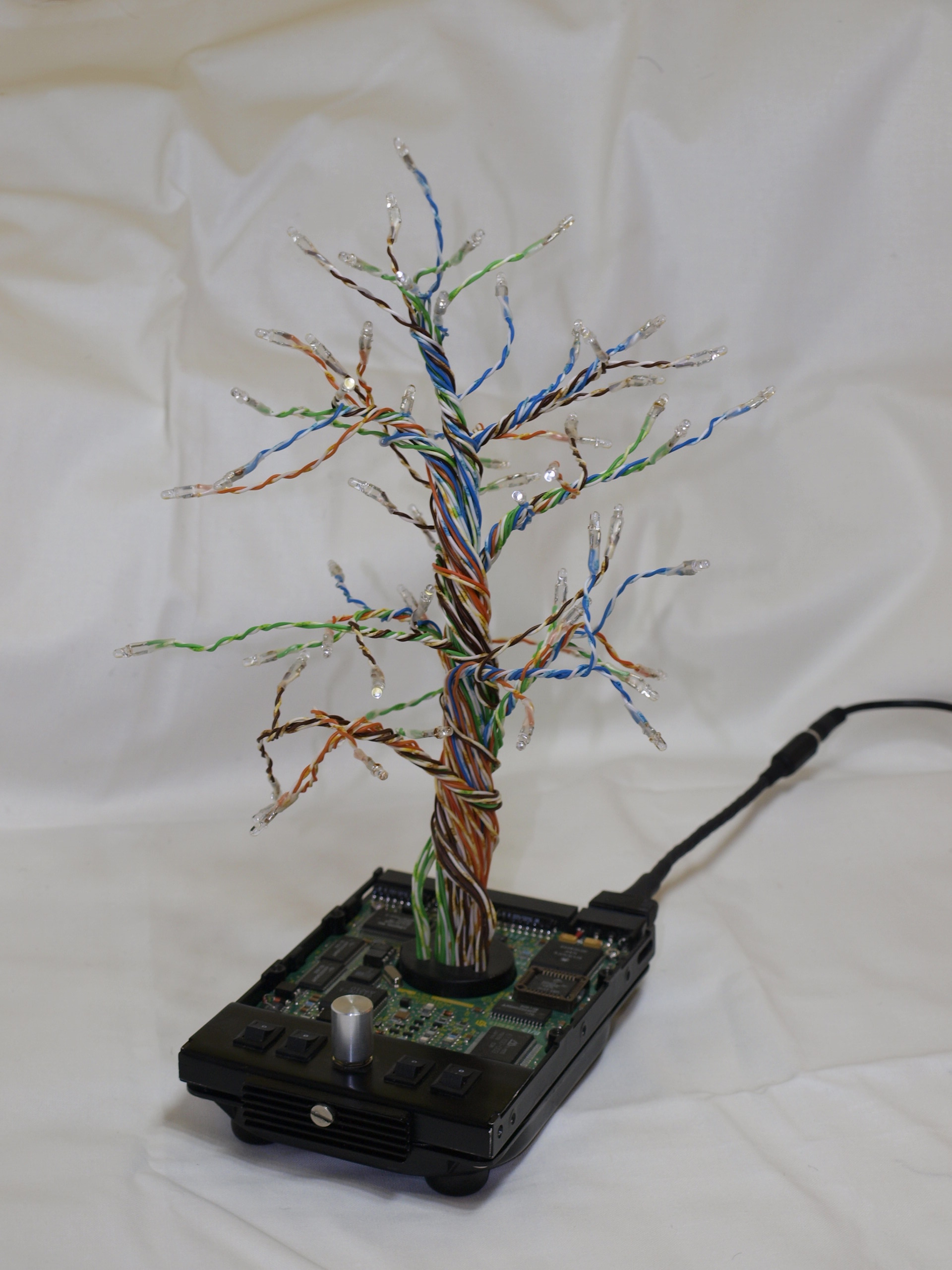 pouzity material: recyklovany HDD, LAN kabel, vysokosvietive LED, kusok chladica z grafickej karty a este zopar komponentov...Da sa nastavit RGB + biele svetlo.