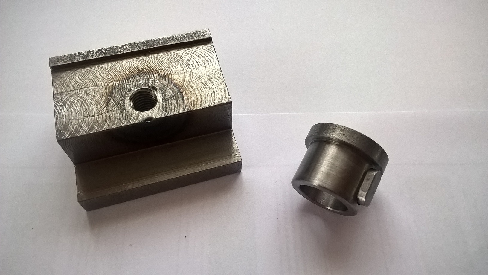 chtěl jsem taky soustruhu dát něco pod stromeček (Nortonky) :lol: a tak jsem vyrobil kámen zapevnění suportu (když se napřesno zarovnávají čelní plochy. Originál mi chybí). Bohužel jsem při odměřování hloubkoměrem posuvky špatně matematicky odečetl vzdálenost záviru od hrany (od vrchu tyčky průměr 10mm) 14mm - 5mm (polovina průměru 10mm), myslel, že to je 8mm. Prozradím to, je to 9mm :) a na tuto hodnotu jsem to musel opravovat.