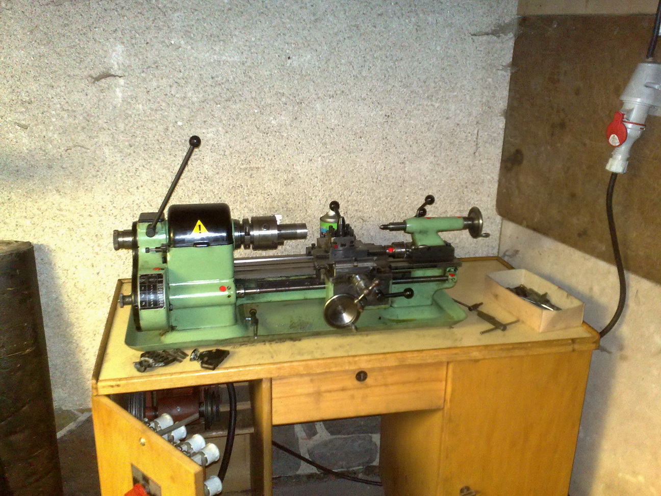 Stuj je z drevotrisky, nebo latovky, moc jsem ho nezkoumal. Pan tvrdil, ze soustruh je nejaka vratka ze SSSR, tak mozna proto. Ma to i nejakou podivnou elektroinstalaci, kde je trafo na 110V a stykac je tim 110V napetim spinanej a tak.