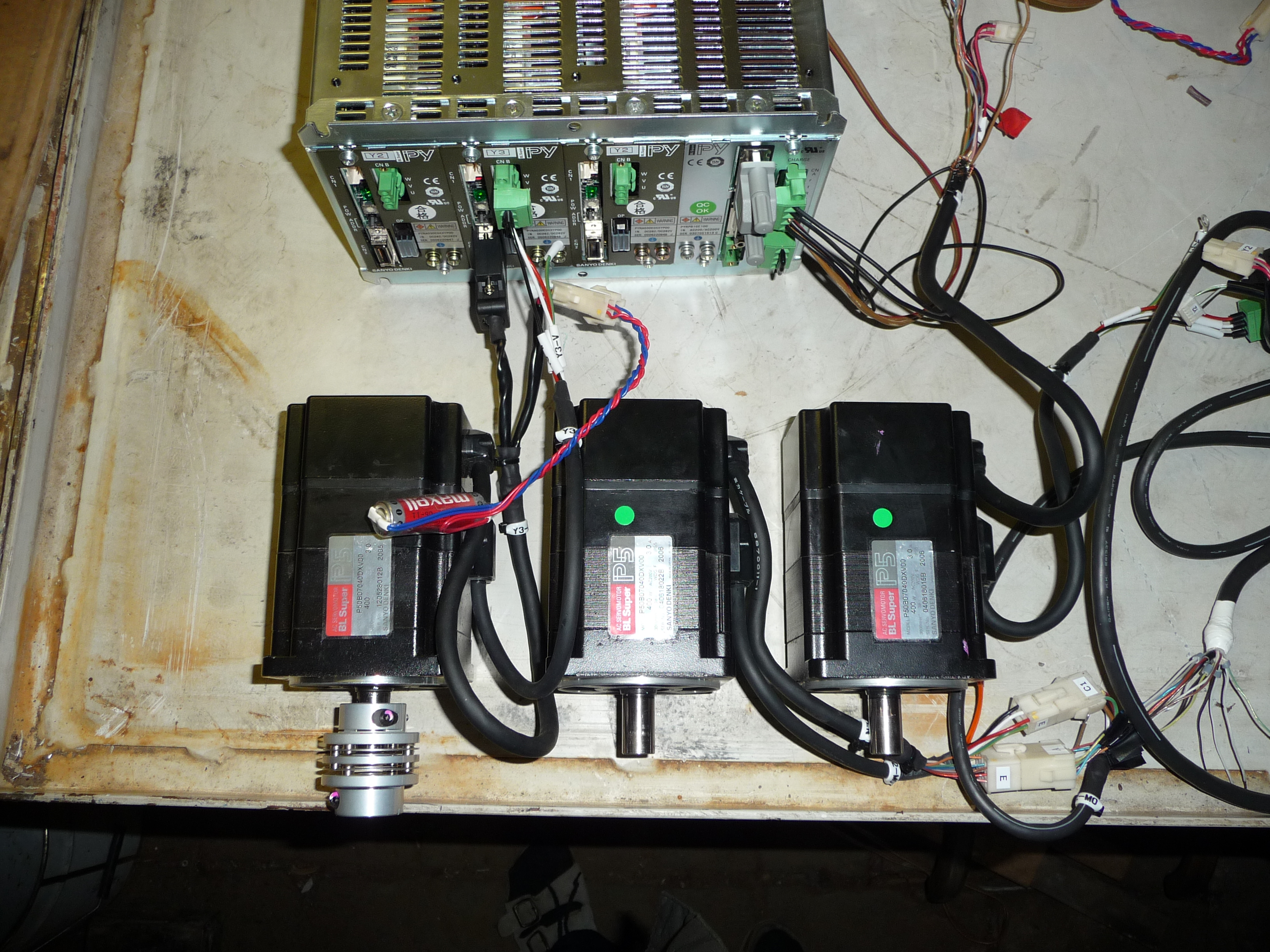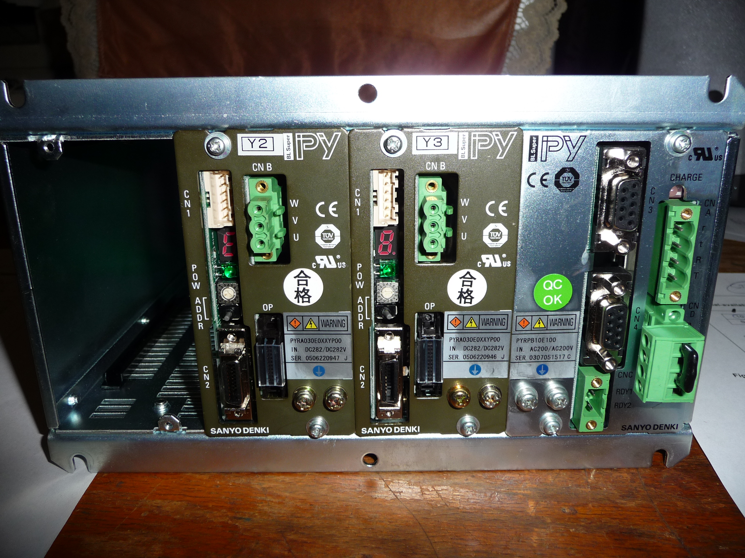 První řadě děkuji za odpovědi. Baterie nejsou vybité ale při demontáži byli odpojeny u dvou motorů asi na 2 týdny. Pravý stříbrný modul slouží jako napájecí zdroj pro 3 výkonové jednotky AC serv. Dále je tu konektor pro připojení brzného odporu, výstupní rele kontakt a dva 9pin konektory pro komunikaci. Takže teď mám tedy za ukol sehnat OP remote operator (to bude asi problém) a nebo by měla být možnost připojit přímo k PC například přes RS-232. Moc by mi pomohla dokumentace přímo k tomuto modelu. Už jsem zkoušel psát přímo výrobci takže čekám na opověď.