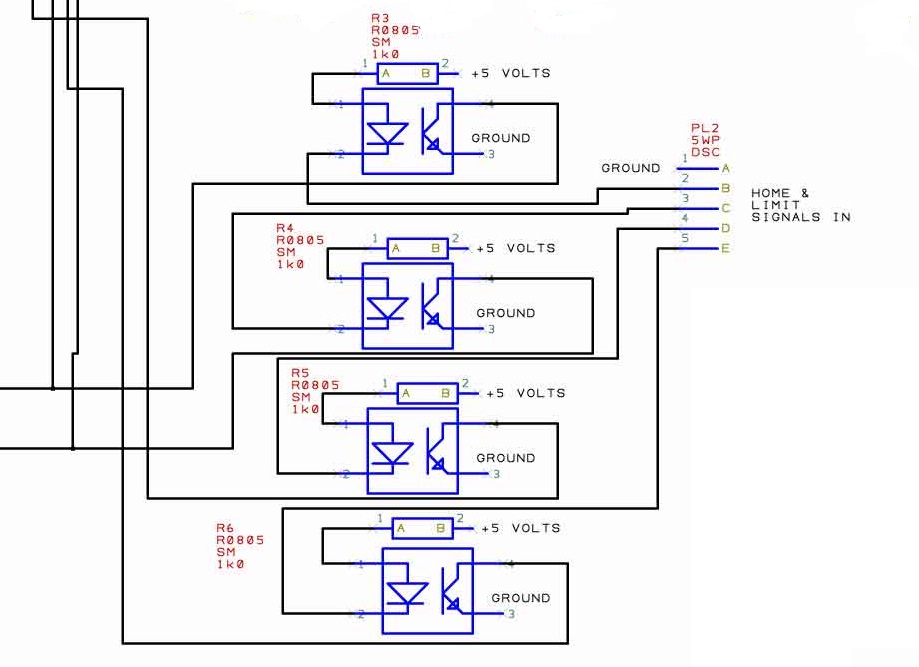 Ještě doplním: Nevím jak u někoho, ale já mám na mé 3-osé desce zapojeny vstupní piny takto: A-GND,B,C,D-přes optočleny na LPT piny 10,11,12,13. Potom lze použít různé kombinace pro různé vstupní spínače. třeba pin B(LPT10) pro všechny Home, C(11) pro všechny --, D(12) pro všechny ++ a E(13) pro stop.
