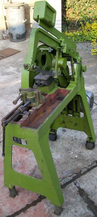 Hlavní řemeny mám Z 1570Lw 10x1550Li Z 61, lépe by se dávaly tak o 50 mm delší, ale pasují dobře. Úskalí je, že nevím, zda je původní malá řemenice a motor, je maďarský. Originální chlazení nemám, dal jsem tam malé zubové čerpadlo, které pohání O-kroužek, při těch otáčkách a stavu čerpadla to dotlačí tak akorát. Nádoba je uříznutý plastový kanystr, pod odtokem v něm stojí sklenička jako přepad na zachycení pilin. Výhoda je, že stačí necelý litr kapaliny. Přestavitelná čelist svěráku už nedržela v drážkách a tak jsem přidělal na rám matici a svěrák svírá dlouhý šroub. Další úpravou je šroub na pomalé spouštění do řezu aby se daly řezat slabostěnné profily. Na konci závitové tyče je ruční klika a tou se přidává