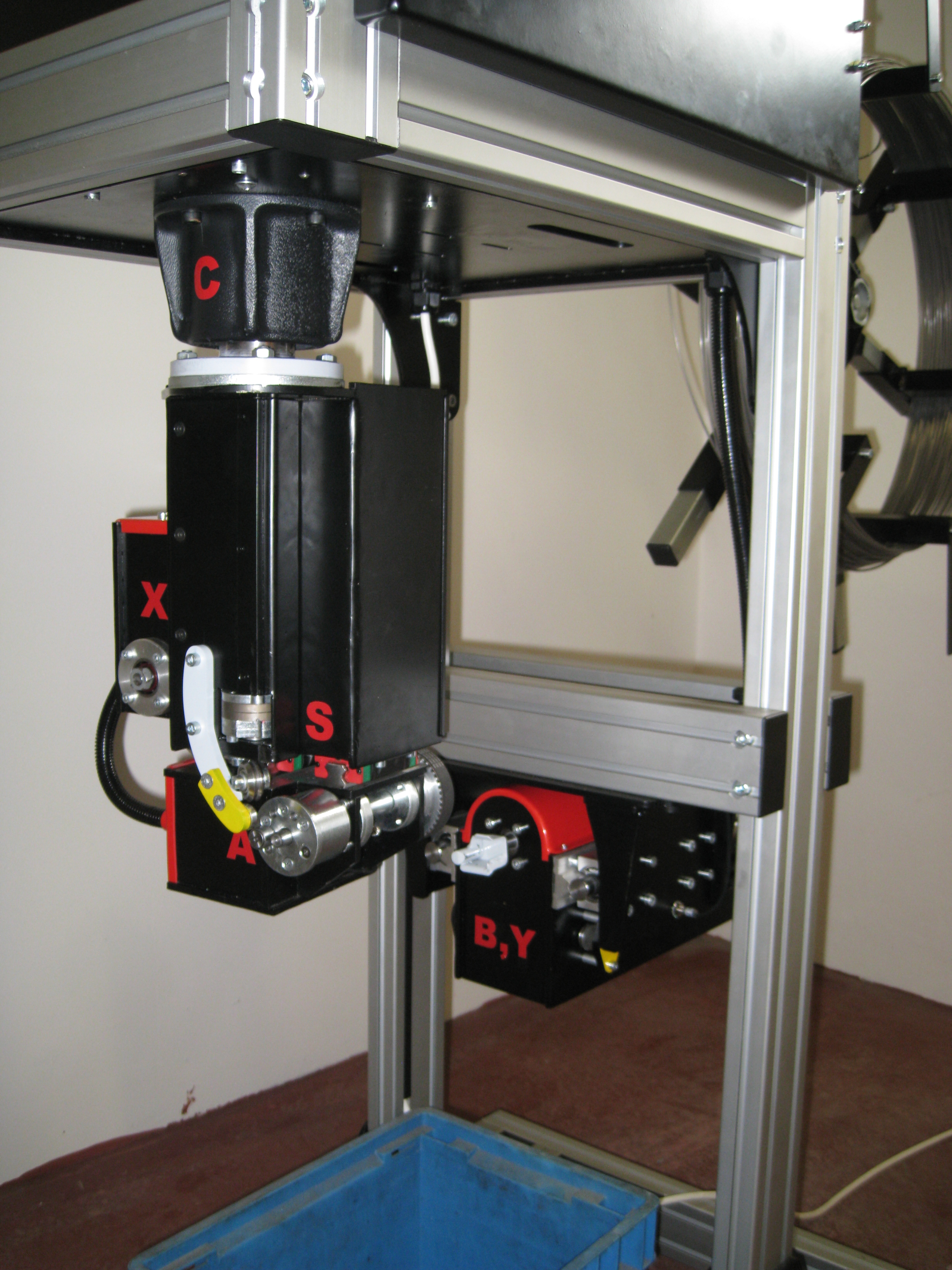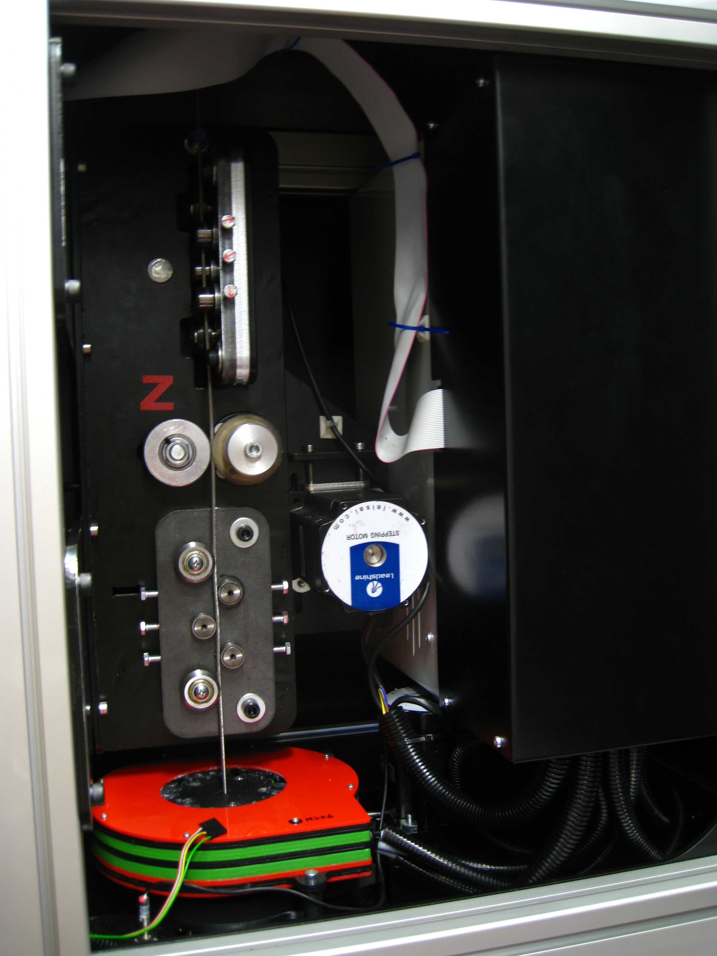 Co se týká vnitřní části ohýbací hlavy tak v horní čísti je 6,8Nm krokový motor na jehož hřídely je plochá spyrála po níž se odvaluje kladka, která přes páku stříhá drát. V levé části je 1,3Nm krokový motor spojený ozubeným řemenem s trapézovým šroubem. Otáčením tohoto šroubu se vysouvá a zasouvá spodní modul. Ten obsahuje 4Nm motor který je spojen přes ozubený řemen s ohýbacími kladkami. na snímání jsou všude použité indukční čidla. Je zde ještě jedna zajímavost ohýbací hlava se může otáčet o 400stupňů a má mechanický doraz protio přetočení. Uvnitř stroje ta velká červeno-zeleno-černá věc je energetický držák kabelů který umožňuje tak velké otočení hlavy (je to můj vynález