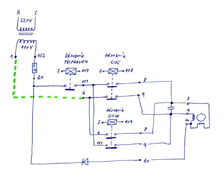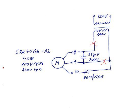 Myslím že to co poslal Radek je ale pro verzi na 220, tohle je ale motor navržený na 110 a proto je u něj ten transformátor, navíc pokud to RaS nakreslil dobře tak to posílá druhou půl vlnu do druhé půlky vinutí taže je to 2x silnější než ve standardním zapojení. Z toho vyplívá že to je dioda jinak by to zkrátka nechodilo. Každopádně by to mělo chodit i na jednu půlku vinutí jako je na obrázku od Radka, ale pokud nepojedeš na 110V tak tam ta dioda musí zůstat.