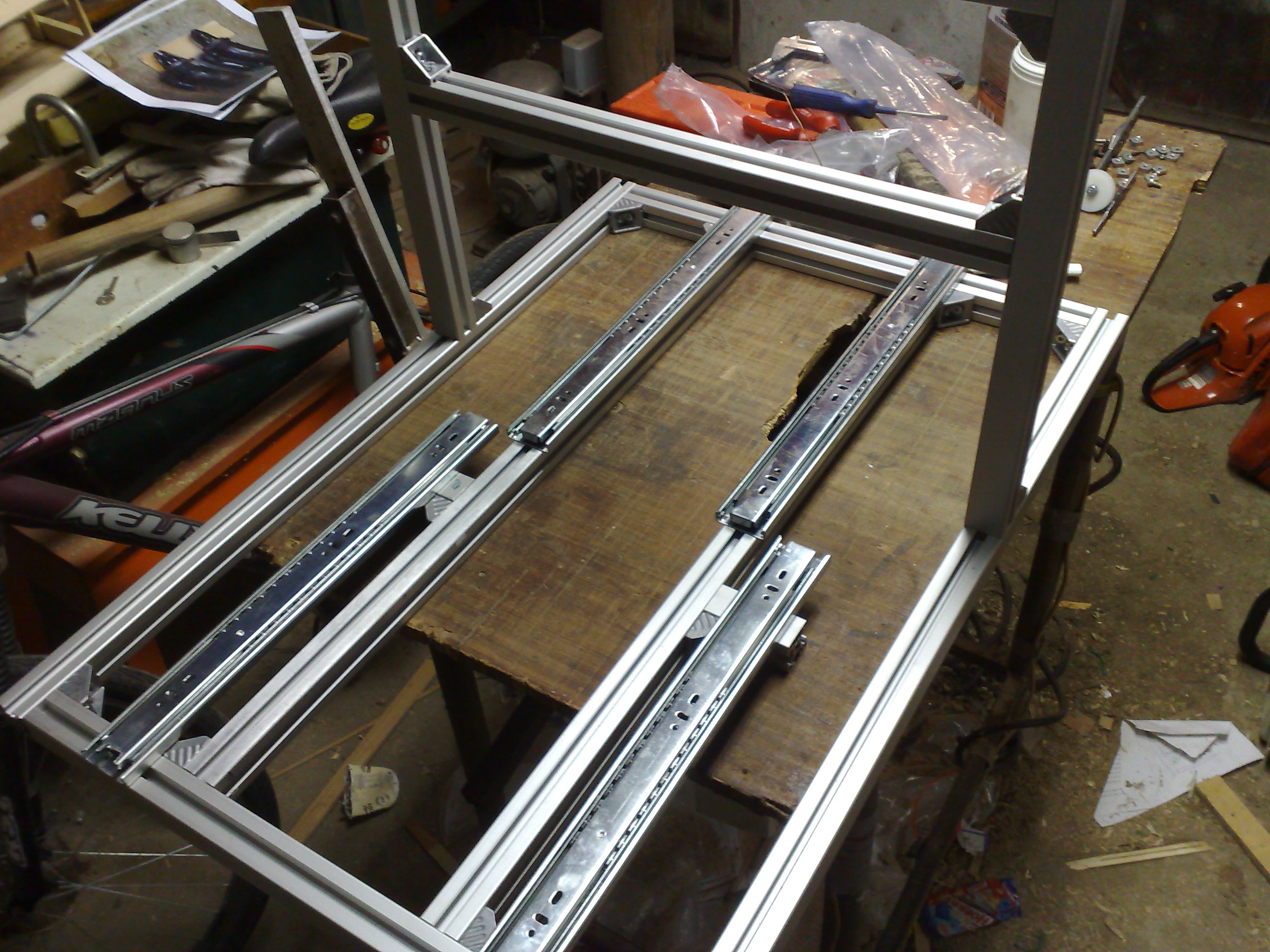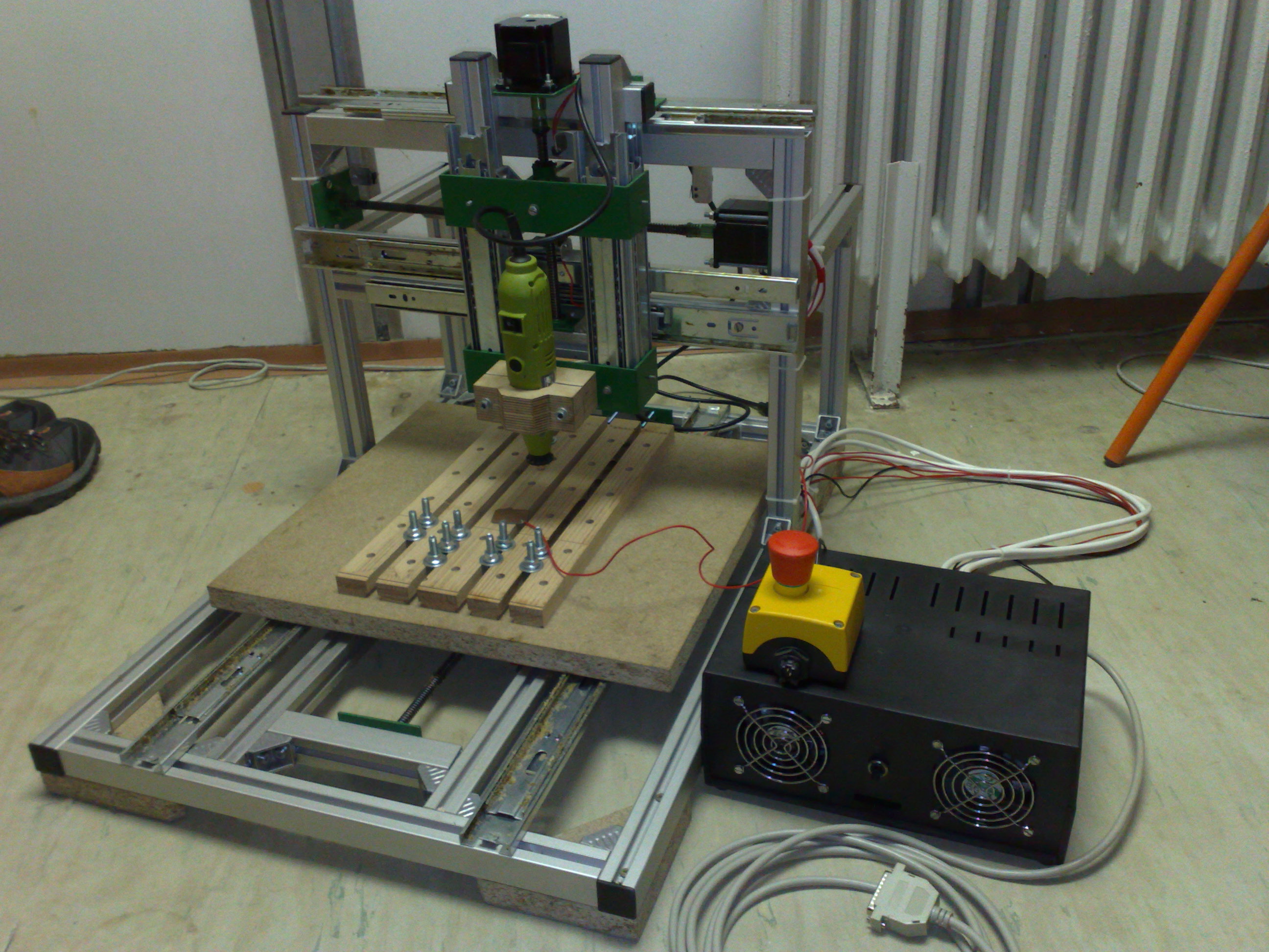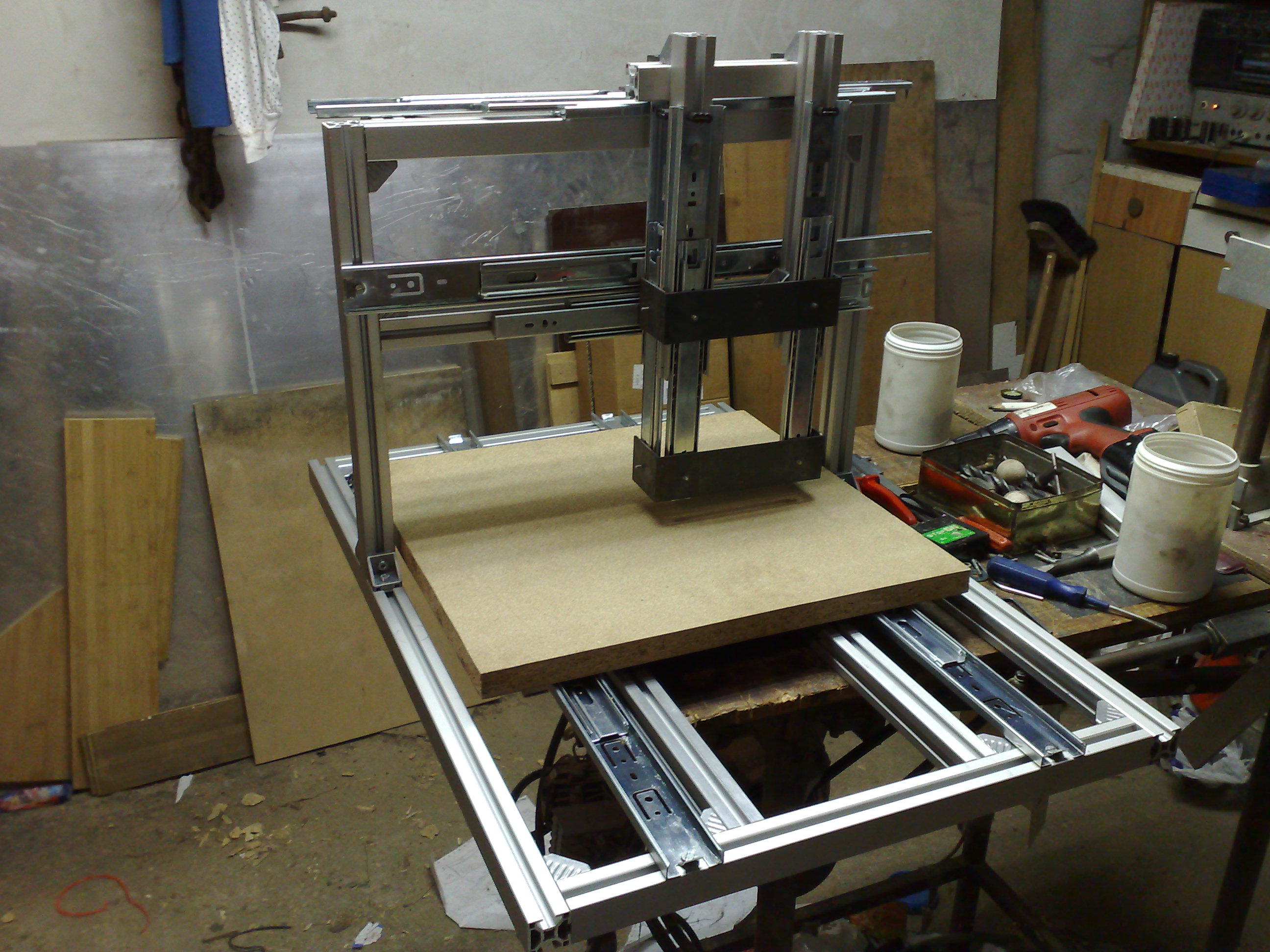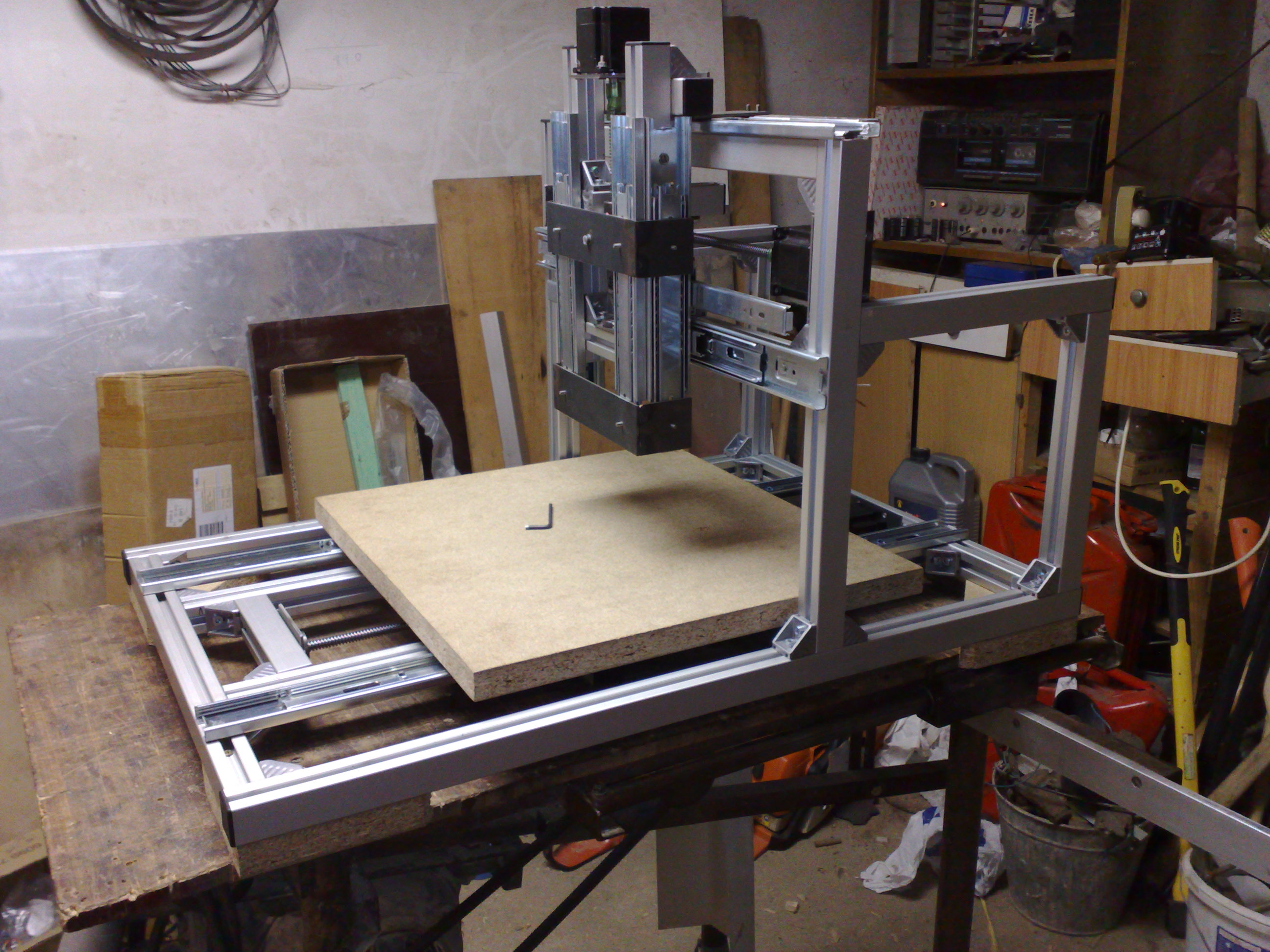 konštrukcia: profily Bosch Rexroth, diely z 3mm plechu, stôl z drevotriesky (zvyšný materiál po prvej frézke :) )
