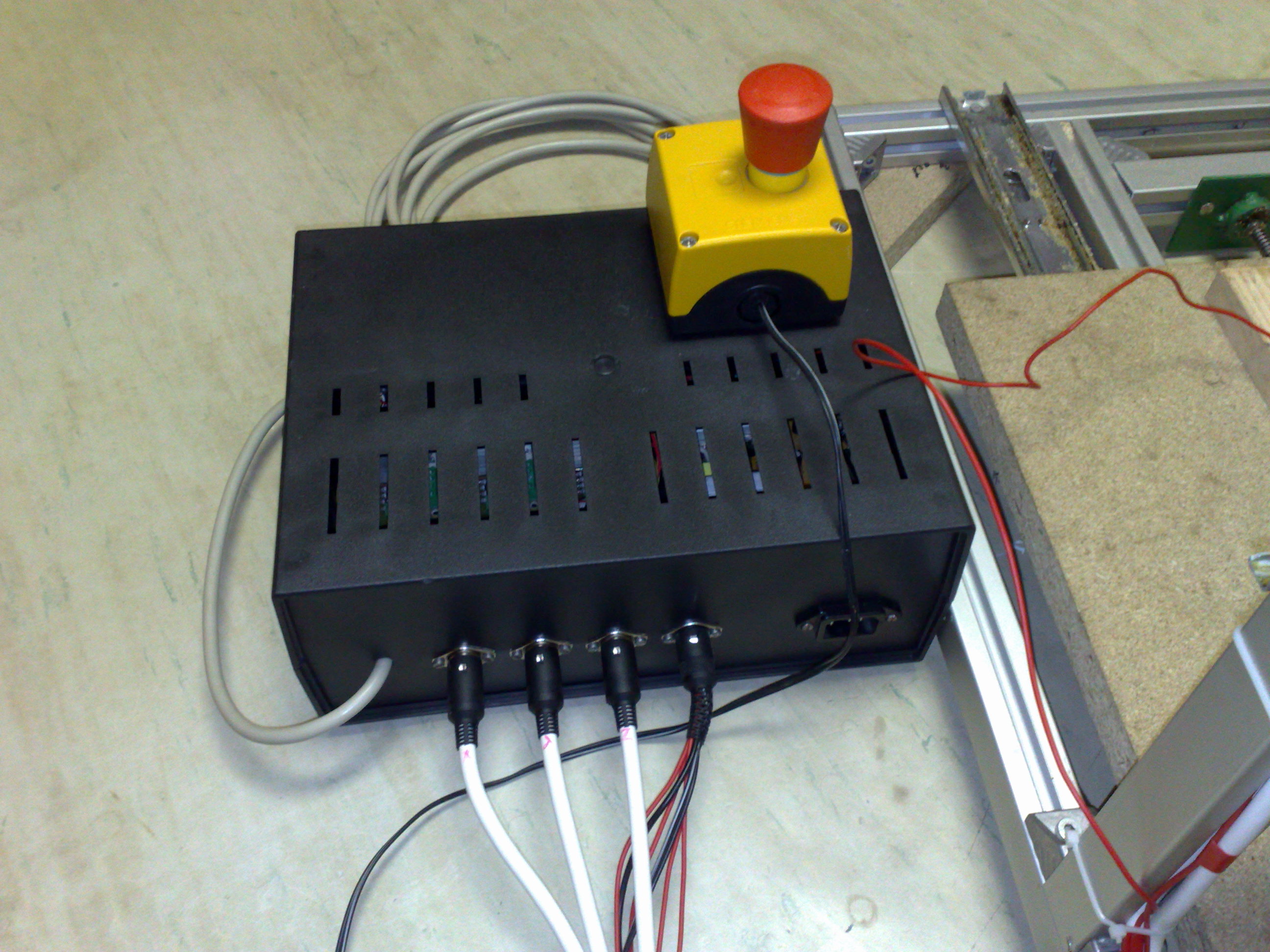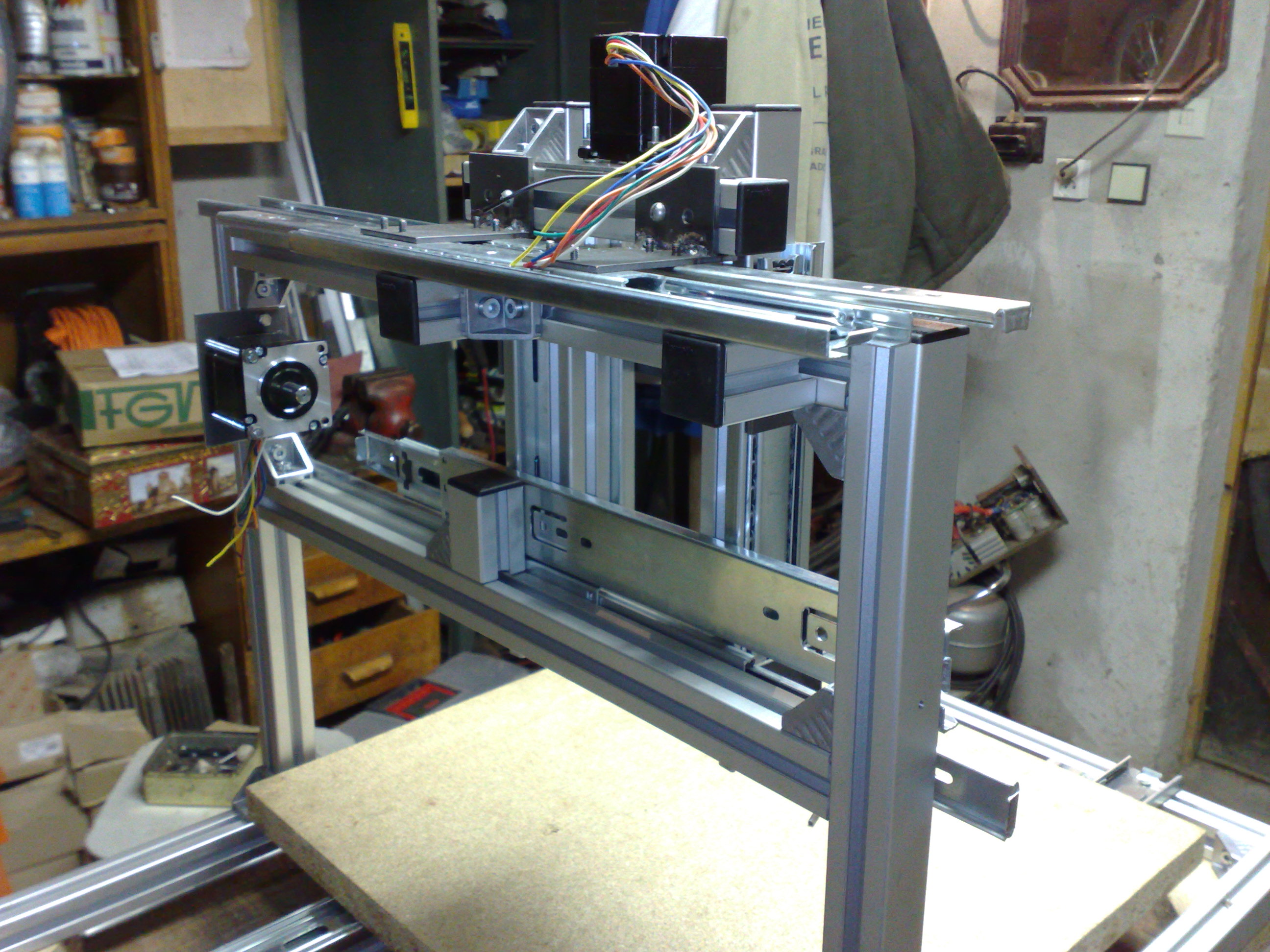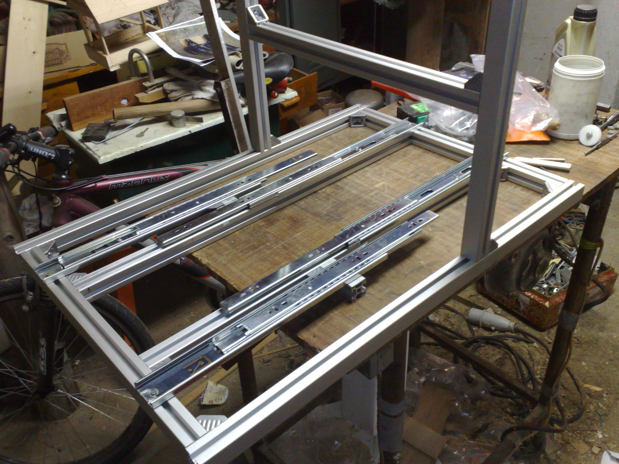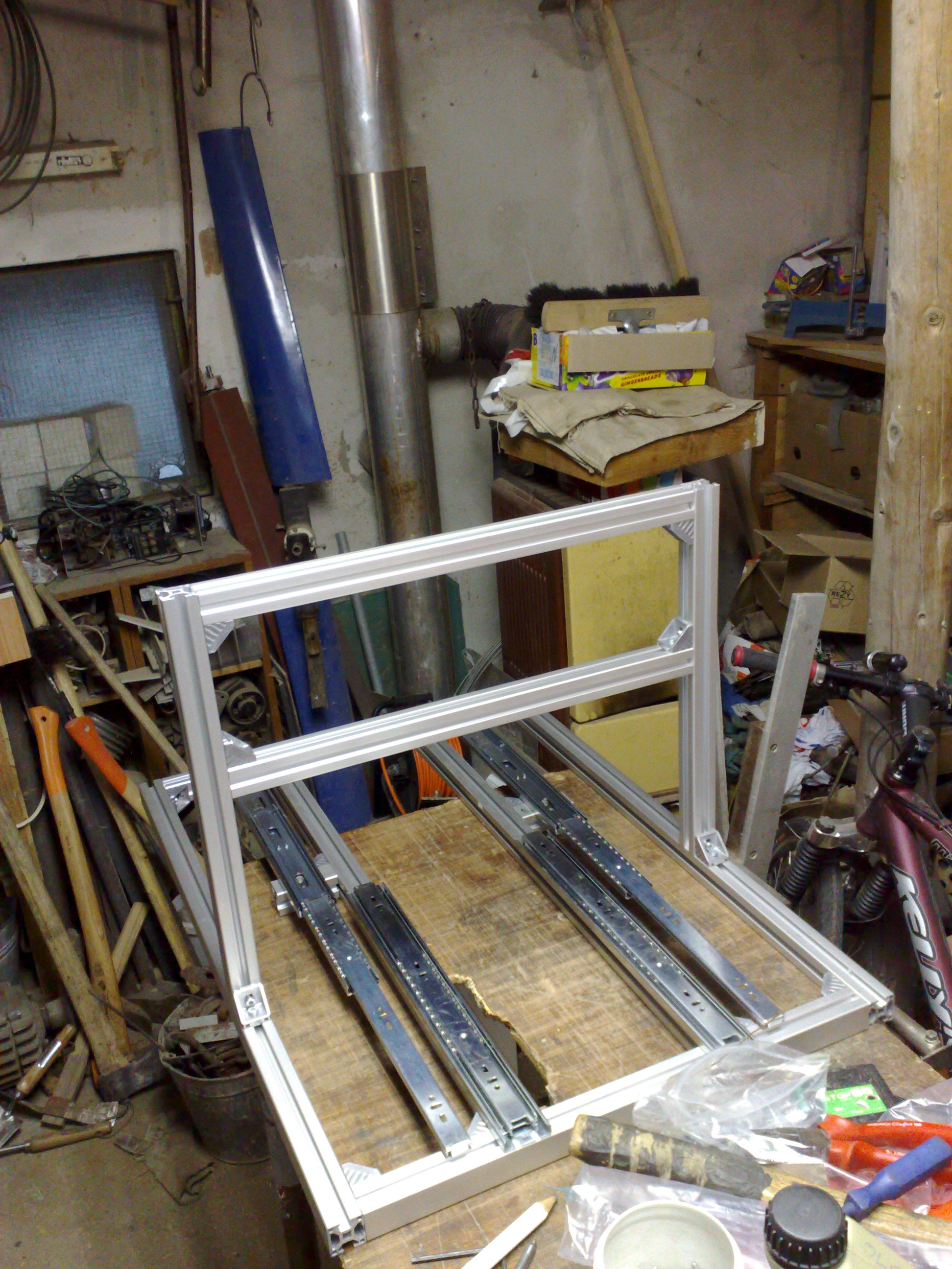 konštrukcia: profily Bosch Rexroth, diely z 3mm plechu, stôl z drevotriesky (zvyšný materiál po prvej frézke :) )