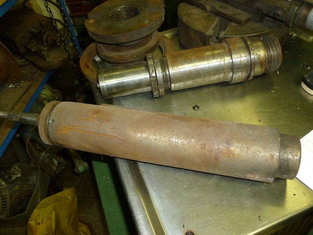 5) nedodělané vřeteno - hřídel se záv. M68x6, L=cca 330mm + domek s ložisky, cena 200,-