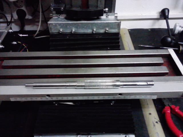 Vůly jsem vychytal podkládáním hřebenu ocel. plechy 0,1mm, ozubenou hřídel jsem prodloužil a v závitu přilepil a celou tu ozubenou tyč uložil do ložisek. V té ploché oceli blíže ke stroji je taky ložisko, aby se hřídel neměla snahu prohýbat a byl řemen stále napnutej.