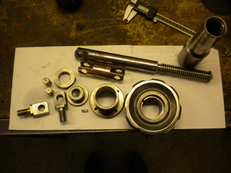 Pohled na hotove dily napinani remenu jednoho motoru. Obe strany jsou identicke. Nejprve mi na jednu stranu schazel krizovy kloub, ten jsem nakonec nasel v hromade zbytku od hadrovych kotoucu u motoru: