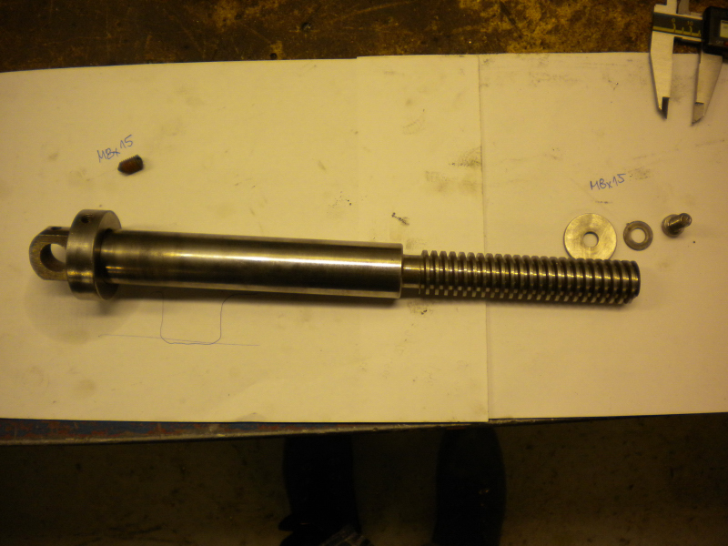 Napinaci sroub vcetne dorazoveho krouzku a koncoveho sroubu, ktery zamezi uplnemu vysroubovani. Na papiru pro jistotu poznamenany delky sroubu pro pozdejsi kompletaci: