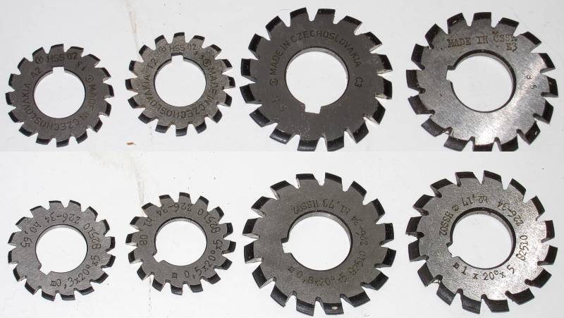 1) je to optický klam, poměr výšky profilu zubu na nástroji a hloubky zubu na kole není stejný u nástrojů pro jednotlivé moduly, tj. nástroj pro větší modul se zanoří do mat. větší částí než nástroj pro menší modul. To je vlastně dané i tloušťkou frézy, pokud by řezal celý profil zubu na nástroji, byla by tloušťka frézy +- autobus 3-4 x m, tj. pro modul 0,3 by to vycházelo na cca něco přes 1 mm a to je ta fréza určitě tlustější. Pokud by se porovnávala na fotce jen ta část profilu která skutečně řeže, tj. 2,25m, zbytek profilu by neklamal oko a vycházelo by to asi líp