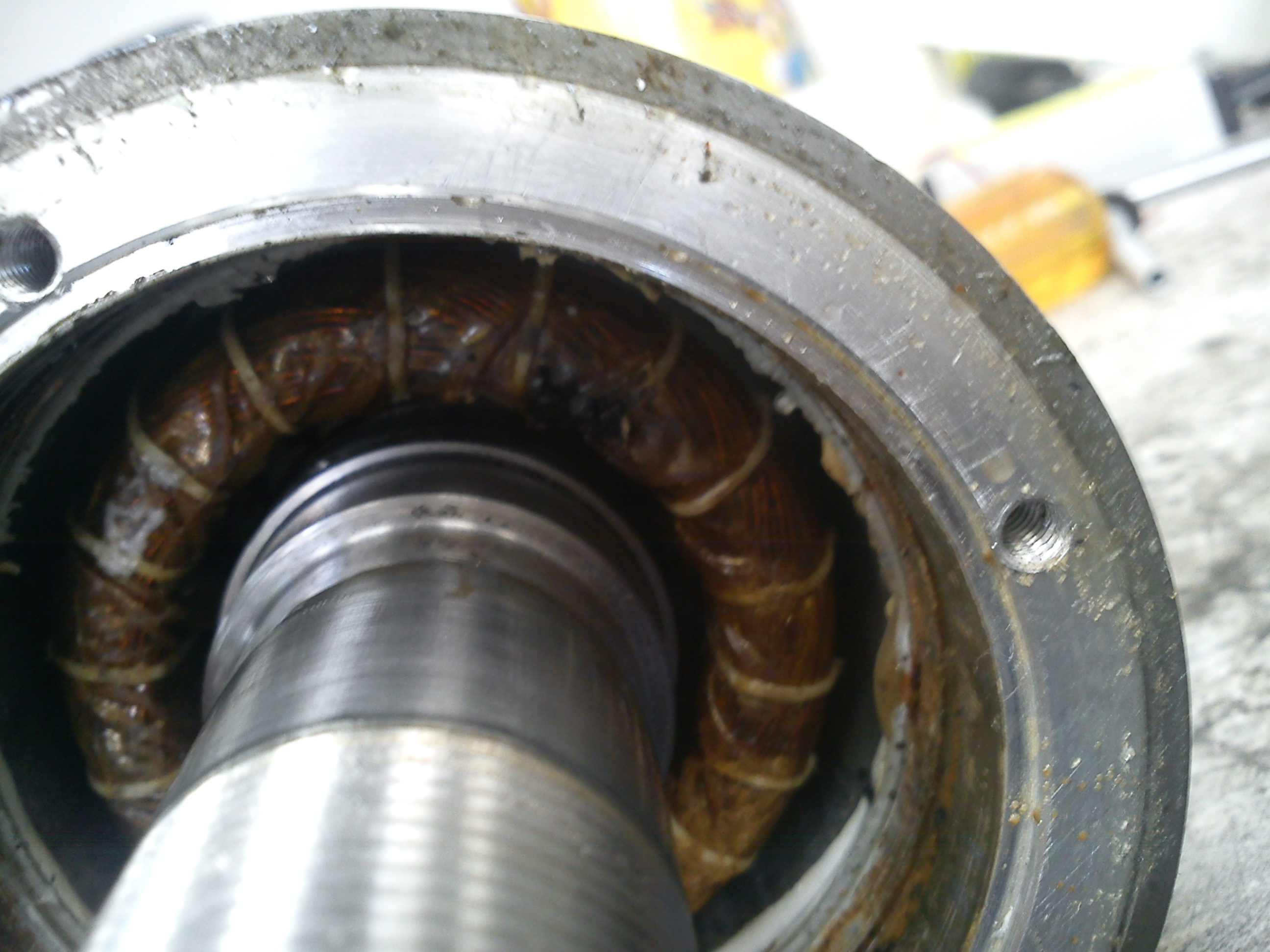 Vřeteno jsem takto rozebrané vzal a vysušil v peci, toto stačilo aby zmizel šlus na kostru. Nyní chci ještě vinutí naimpregnovat ale bohužel jsem zatím nebyl schopný povolit šroub který drží vrchní ložisko ( došel jsem už do stádia že jsem k šroubu přivařil klíč ale i tak nic ještě s tím budu muset asi bojovat). Horší bude zajisti aby se vše neopakovalo což bude asi dost oříšek, no uvidíme.