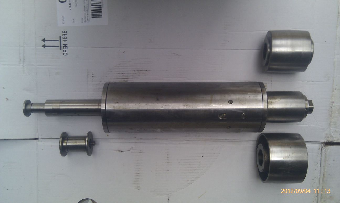 Ano, je tam závit, přesný, M10, to v červenem obdélníku lze odebrat, zbytek je pevná hřídel vřetene s dírou, zítra mohu změřit vlastní průměry a délky osazení. Po jistých úpravách, jistě i jsem to tak původně měl vymyšleno, ale koupil jsem jiné vřeteno (s pneu výměnou ISO30)